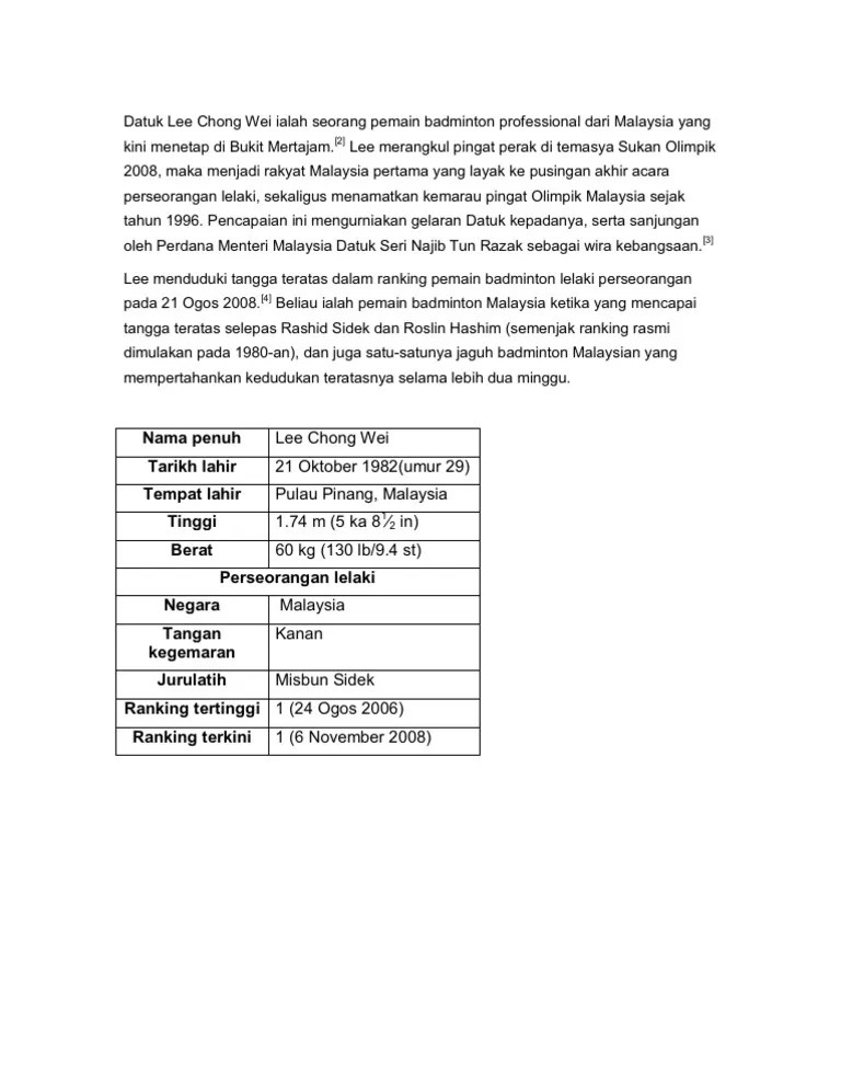 Kk sejarah ii docx pengenalan badminton merupakan sejenis sukan raket yang dimainkan oleh . Biografi ( lee chong wei ). Datuk lee chong wei datuk lee chong wei (born october 21, 1982 in bagan serai, perak) is a professional badminton player from malaysia who resides in bukit . Datuk lee chong wei ist die ehemalige nummer 1 der. Dato lee chong wei bukanlah nama asing bagi rakyat malaysia. Karangan biodata datuk lee chong wei malayfuad. Buku panduan pengurusan mssm tahun 2011 ini disediakan khas sebagai buku rujukan untuk unit sukan, jabatan pelajaran negeri dan semua pengerusi teknik dan .